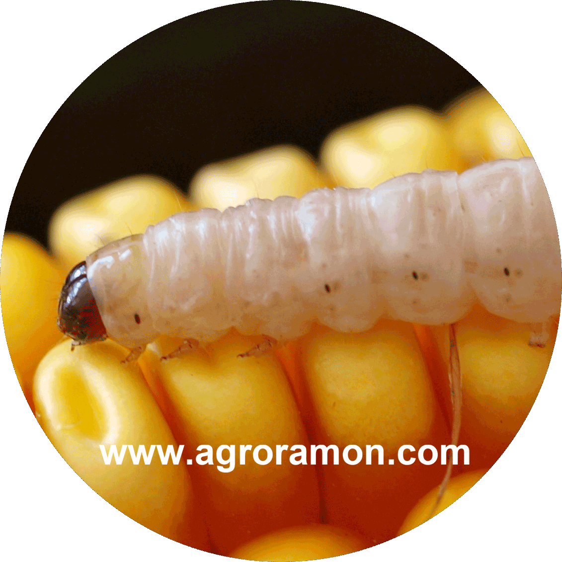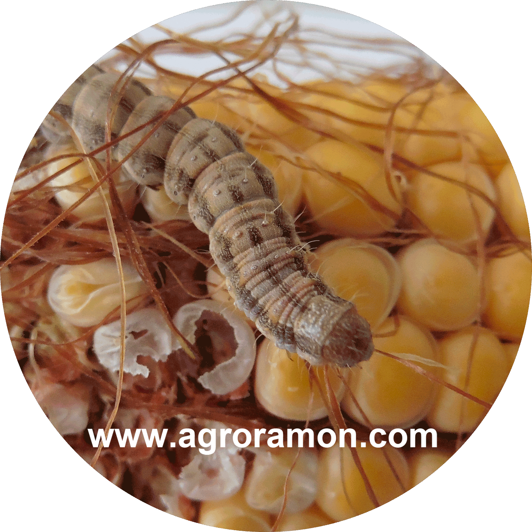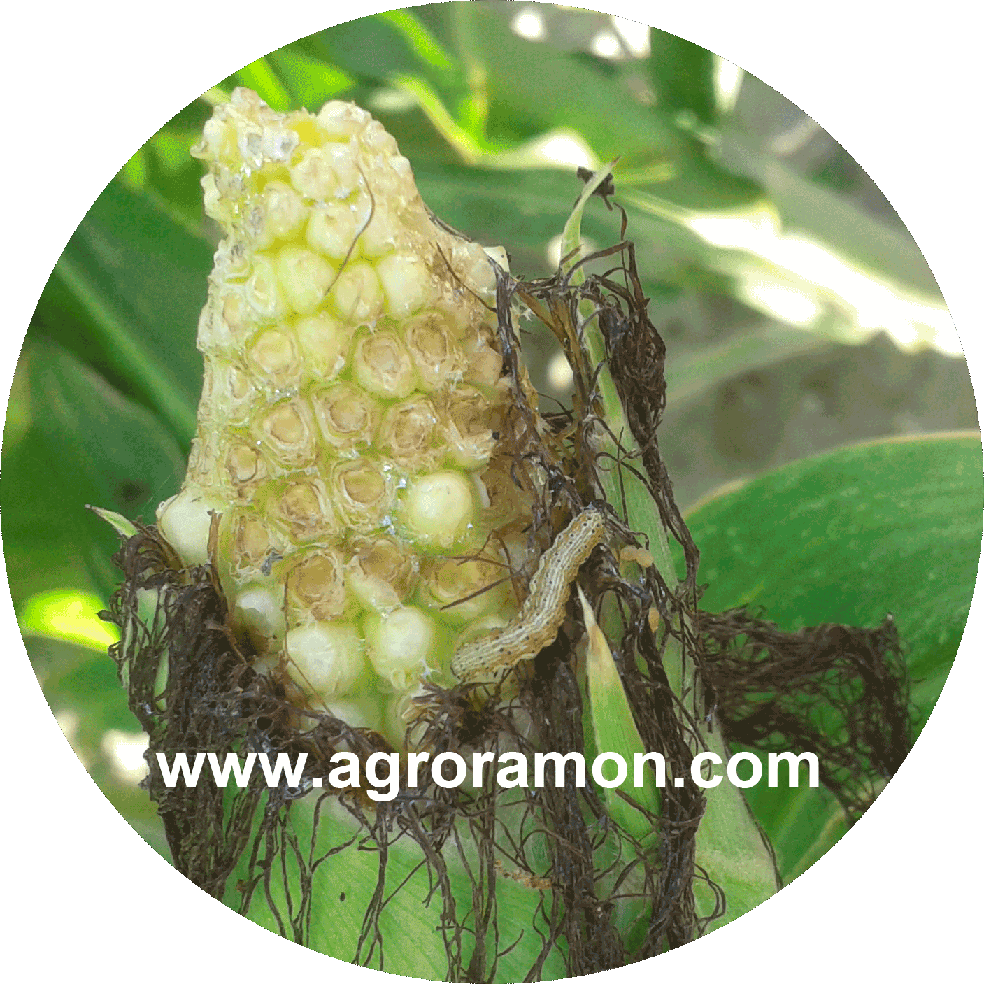 - Cuando se han formado las mazorcas, los huevos los ponen en las fibras de las mismas y cuando nace la larva realiza un orificio hacia el interior de la mazorca disminuyendo la producción e incluso llegando a secarla o impedir que se llene el grano, pudiendo llegar reducir la cosecha por completo.